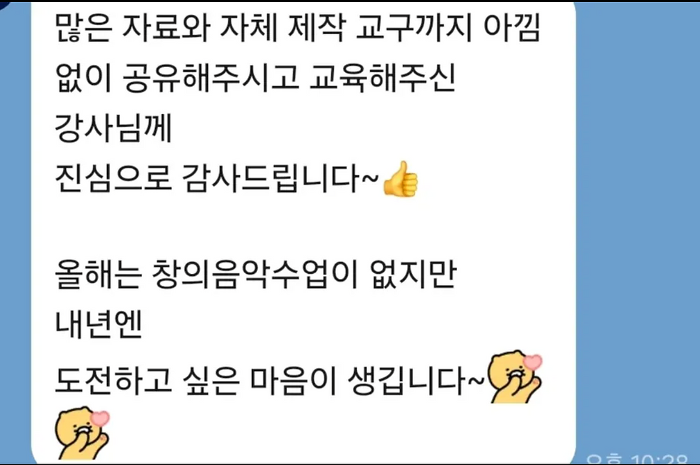 2월부터 시작한 '정은주강사님'의 열정적인 강의, 창의놀이 프로젝트는 매월 1회씩 다음달에 선생님들께서 수업할 내용을 사전 교육 해드리고 있습니다.신규강사님들이 실전에서 바로 사용할수 있도록 연간프로그램 및 교육을 제공하는 프로젝트입니다.사전계획된 연간프로그램 상세교안을 토대로 정은주강사님이 현장에 직접 적용 해보면서 얻은 찐노하우들을아낌없이 모두 나눠주고 계신답니다!아이들이 고정적으로 참여가 어려운 늘봄・돌봄교실의 특성상 반복적인 연습을 통한 악기 수업보다는 쉽고 간단하지만 다양하게 표현될수 있도록 음악적 요소도 놀이법의 하나로 사용하고 있는데요. 강사님이 추천해주신 계이름 도미노, 똑같은 도미노 게임이지만 이렇게 계이름 카드를 생활속 소품인 집게나 메모클립을 이용하고 친구들과 함께 힘을 합쳐보는 놀이활동으로 응용해 보았습니다.일반적인 도미노를 사용할 수도 있겠지만, 음악선생님이라면 한번쯤 만들어본 계이름 카드를 이렇게도 활용해볼수 있다는 점을 안내해 드렸습니다. 강사님께서 제공해주신 현장 노하우와 풍성한 수업 아이디어를 벌써 활용해보시고 후기까지 남겨주시는 열정적인 선생님들 덕분에 창의놀이프로젝트가 더욱 풍성해지고 있어서 다음 강의도 더욱 기대가 됩니다.#늘봄#늘봄학교#늘봄프로그램#늘봄교육#늘봄강사#늘봄돌봄교실#돌봄교사#돌봄강사#돌봄교실수업#방과후강사#방과후수업#방과후교실#창의놀이#창의음악#음악놀이#한국유아동음악협회#뮤직쌤#with은주쌤#with한나쌤